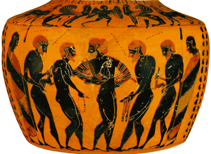 De nombreux vases, en particulier entre le milieu du VIème siècle et celui du Vème siècle, montrent des hommes portant une barbe, en conversation avec des jeunes gens imberbes, en train de les caresser, de les séduire ou encore en train de leur offrir des cadeaux caractéristiques : coq, lièvre, part de viande... ou même bourse qui pourrait contenir de l'argent. Cette relation, fondée sur la belle apparence du jeune homme, trouve dans les exercices de la palestre une occasion privilégiée à laquelle la comédie ne manque pas de faire allusion. Songeons aussi que nous nous trouvons dans une société qui observe une forte ségrégation des sexes.